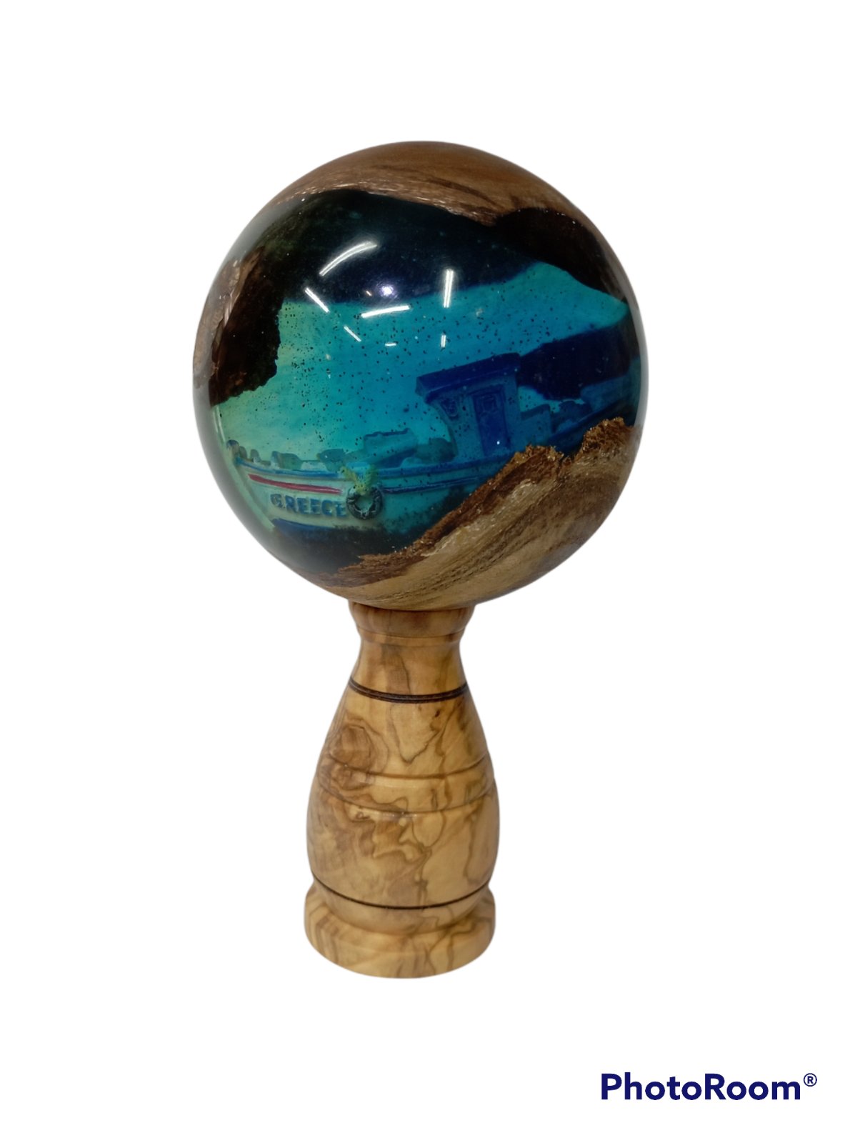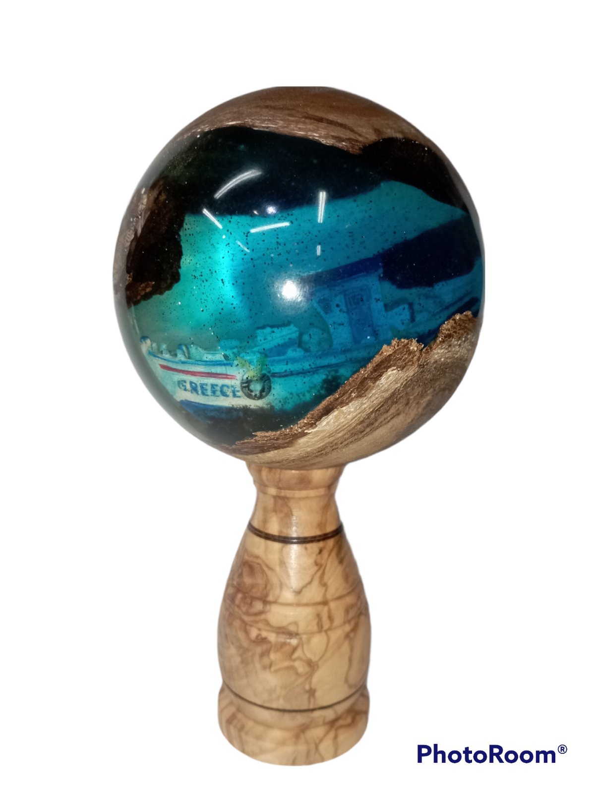 Σφαίρα από ρητίνη και ξύλο δρυς με καράβι μέσα και βάση από ξύλο ελίας. Διάμετρος 17 εκατοστά.κρυφο φωτισμο